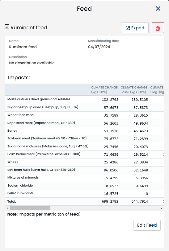 MyFeedPrint size yem ürünlerinin çevresel etkilerinin ayrıntılı ve kapsamlı bir özetini sunar. Bu etki değerleri formülasyon sisteminizde kullanılabilir.